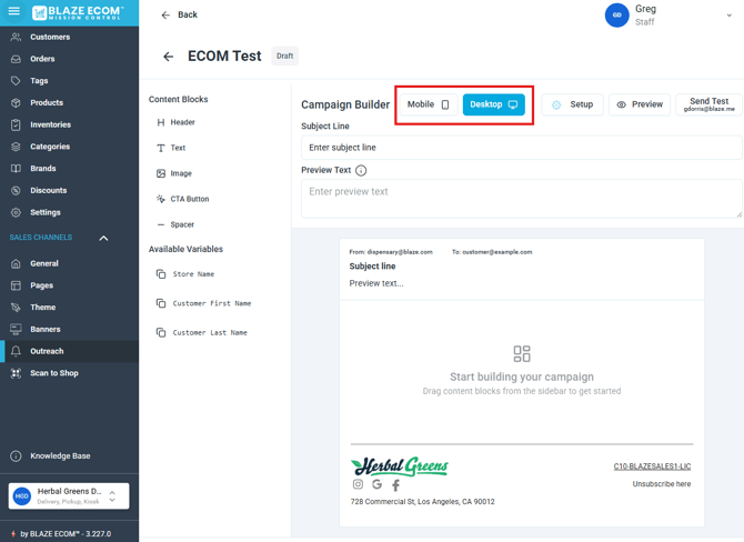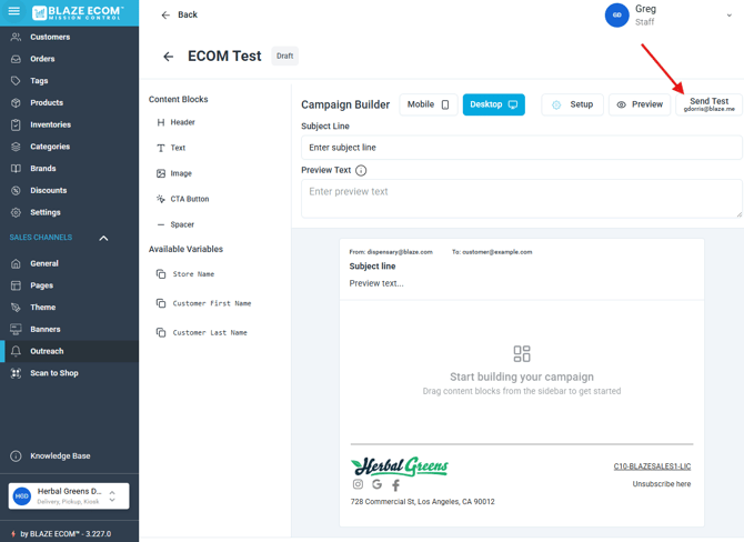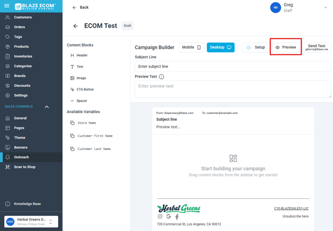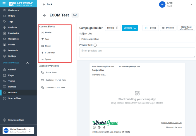 - Email campaigns can be configured with text, images, buttons and store variables. Drag the items from the Content Blocks into the email preview below.