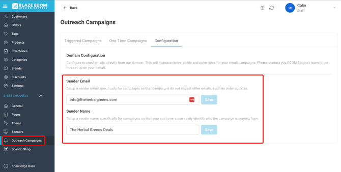 - Once domain is verified, head to Mission Control -> Outreach Campaigns -> Configuration and configure sending Email and Email Name: