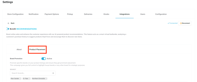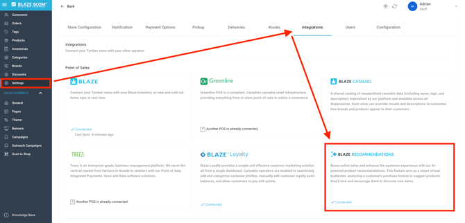 2. Click on Settings > Integrations > BLAZE Recommendations