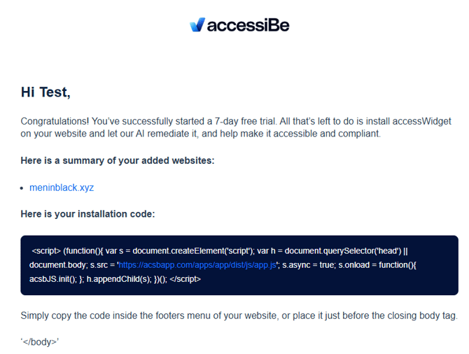 - Once you have signed up and activated an account with accessiBe, you should receive an email with your installation code.