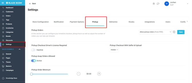 - Login to ECOM Mission Control at ecom.blaze.me and click on the Settings Tab and select Pickup.
