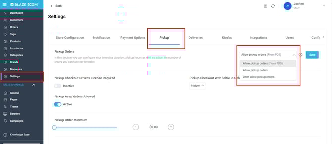 - Allow pickup orders needs to be selected from the Pickup Orders drop down and saved for the Pickup option to be enabled on the store front.