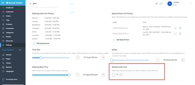 - Default Order Limit allows you to set the number of orders that can be fulfilled in each time slot. Once the order limit number has been reached for each time slot, that time slot will close and make customers select the next available one. If Default Order Limit is set to "0", each time slot will be able to accommodate infinite orders.