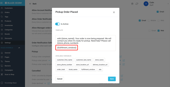 If using Scheduled Pickup fulfillment, we highly recommend adding the customer selected Time Slot window variable to Order Notification templates: