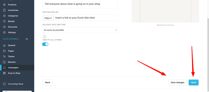 - Send to All Stores: If you have multiple stores in your Ecom group, you can toggle this off to restrict the push notification to app users who most recently visited the store menu you are sending this notification from (aka the store selected in the bottom left)