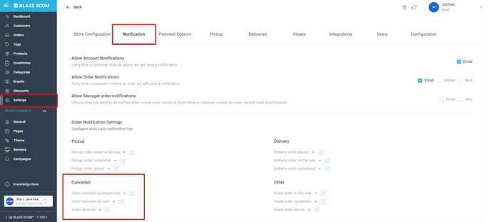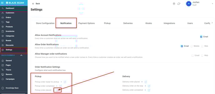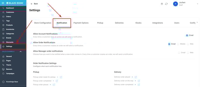 - To setup and edit Pickup Order messages, login to your Mission Control, click on the Settings tab and select the Notification tab.