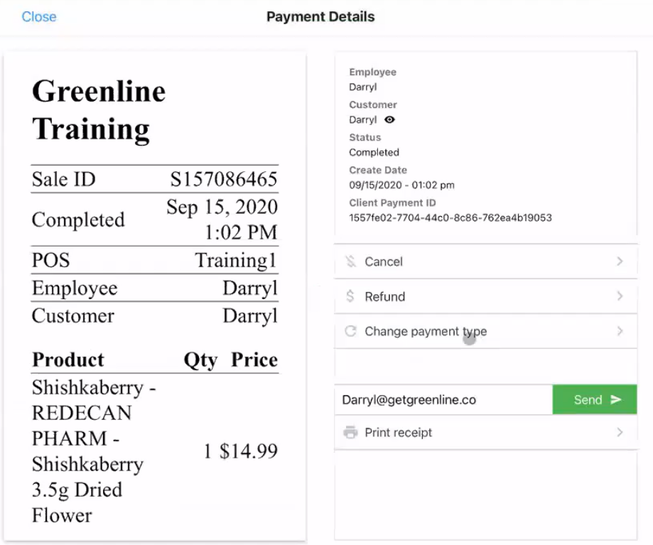 When the refund is complete, you can view, print, and email the receipt. Negative amounts will appear on the receipt to reflect the refund and money returned to the customer.