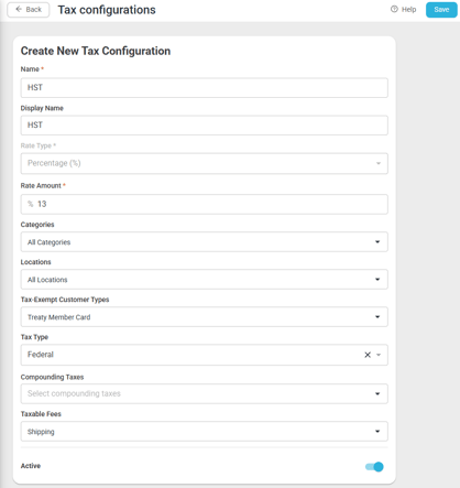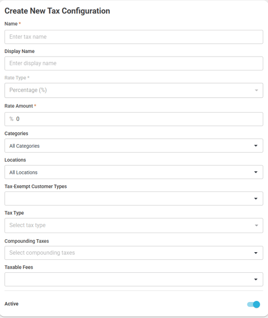 - Active: The Active toggle controls whether this tax configuration will be applied or not. If a tax configuration is set to inactive, it will not show on transactions.