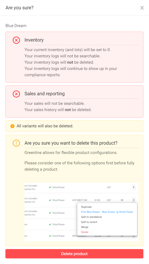 Warning messages will appear prior to the system deleting the selected product. These warnings will display how deleting the product will affect your inventory, sales data, and reporting.