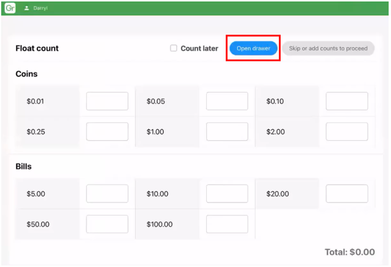 If you choose to count your float now, tap on the “Open Drawer” button and begin counting the denominations. Enter in the quantities into the appropriate fields available in the POS system. The system will keep a running tally of the total.