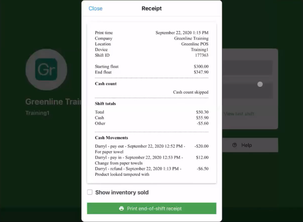 This will take you to a screen where you can view your shift transaction details, sold inventory, cash movements, and print the end-of-shift receipt.
