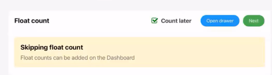 If you choose to count your float later, check off the “Count Later” checkbox and tap on the “Open Drawer” button to take out the cash drawer. Tap on “Next” where you can enter in your passcode and tap on "End Shift".