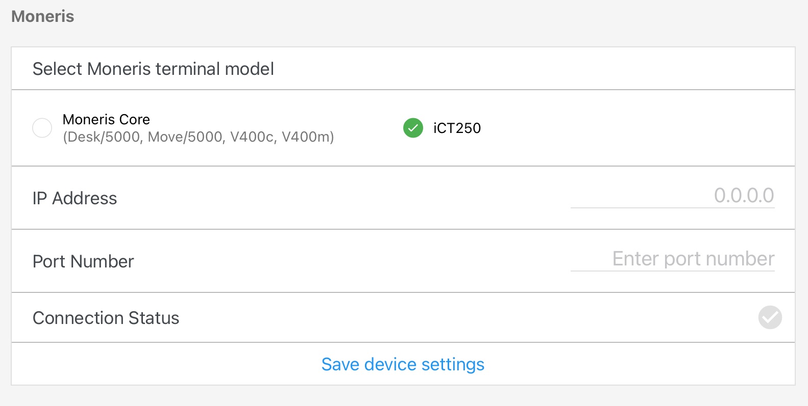 To use the Moneris integration, select which Moneris terminal you are using, then enter your terminal IP address and port number directly into the POS device. Once the Terminal IP address and Port number are configured, you will see a green checkmark to indicate the connection status. Note that the Port Number needs to be 6556 both on BLAZE and the terminal.