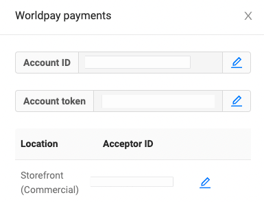 This will initiate a pop-up menu on the right side of your screen, here you will be able to enter your Account ID and Account Token by clicking the edit button. Once you enter the values. Click the save button. These will be provided by Worldpay.