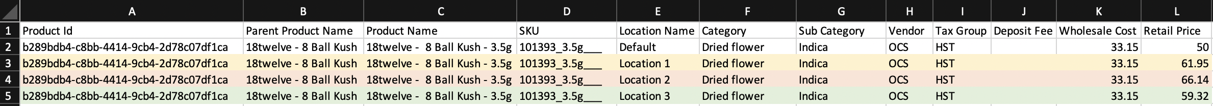 Retail Price (column L) is the column we are editing to add the pricing we would like for each of our locations to serve their respective markets