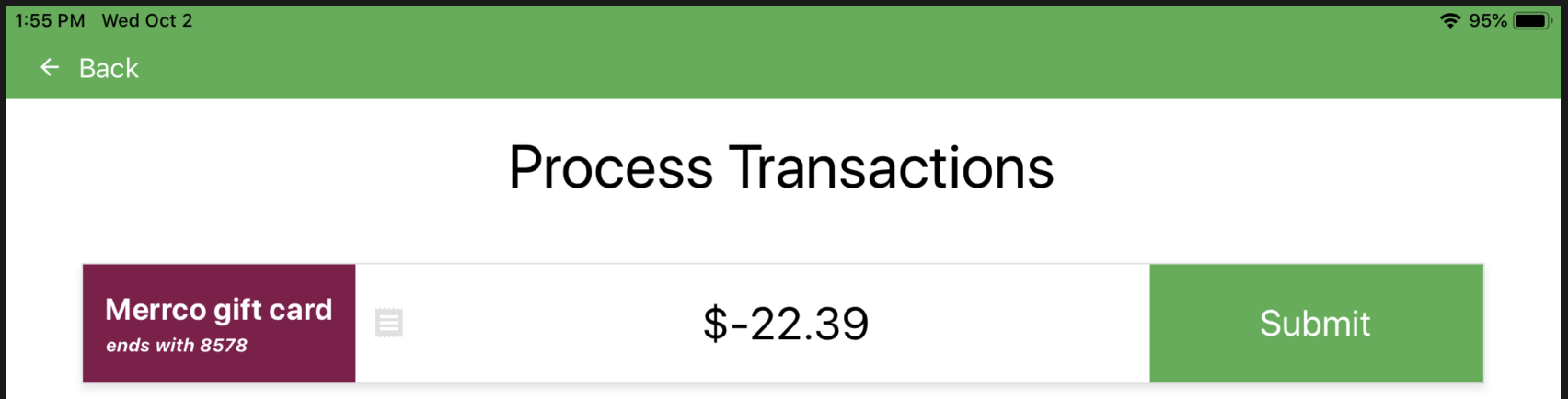 - Swipe the Merrco gift card on the Merrco payment terminal so the barcode is identified.