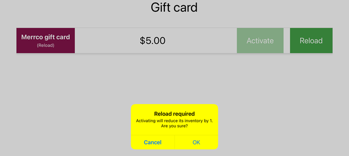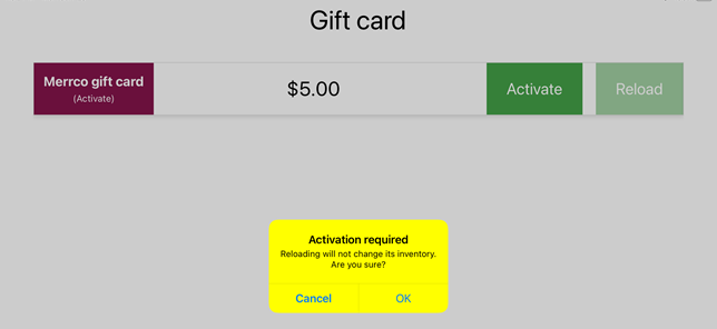 2. Click on the light green Activate button. A pop-up message will appear allowing you to select Activate instead Reload. If the user selects OK, this will impact the Merrco gift card inventory level and subtract 1 unit from your Merrco gift card product inventory.
