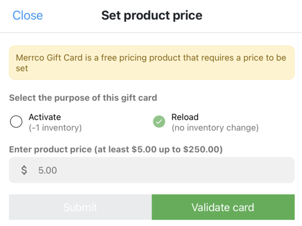 - Select Reload *This will not impact inventory levels because no physical card is being sold to the customer.