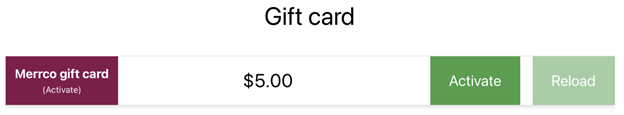 1. 1. After you enter in the Merrco gift card dollar value, you will see the dollar amount alongside the Activate and Reload options. The Activate button appears in a darker green while the Reload button appears in a lighter green.
