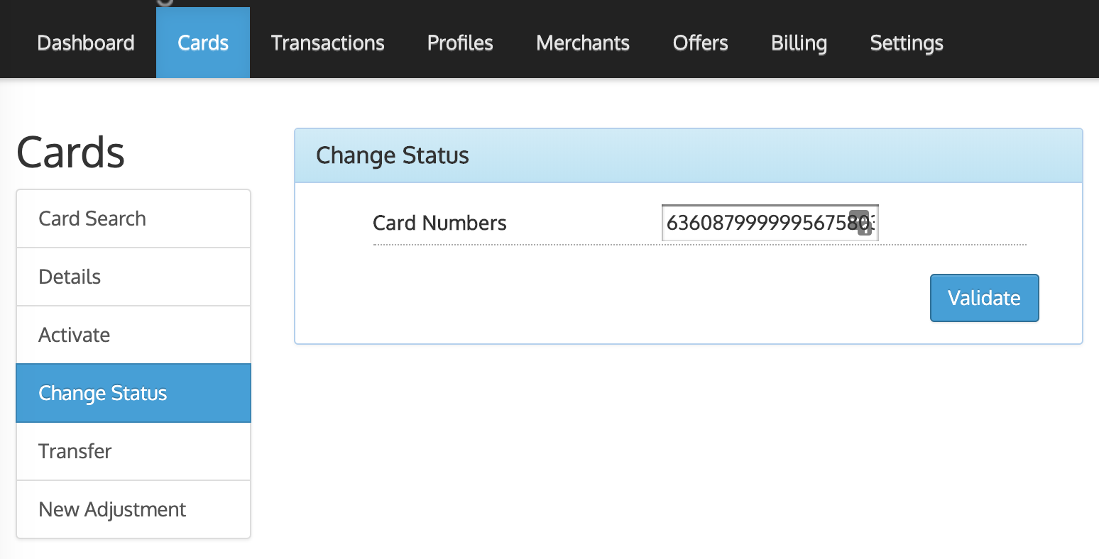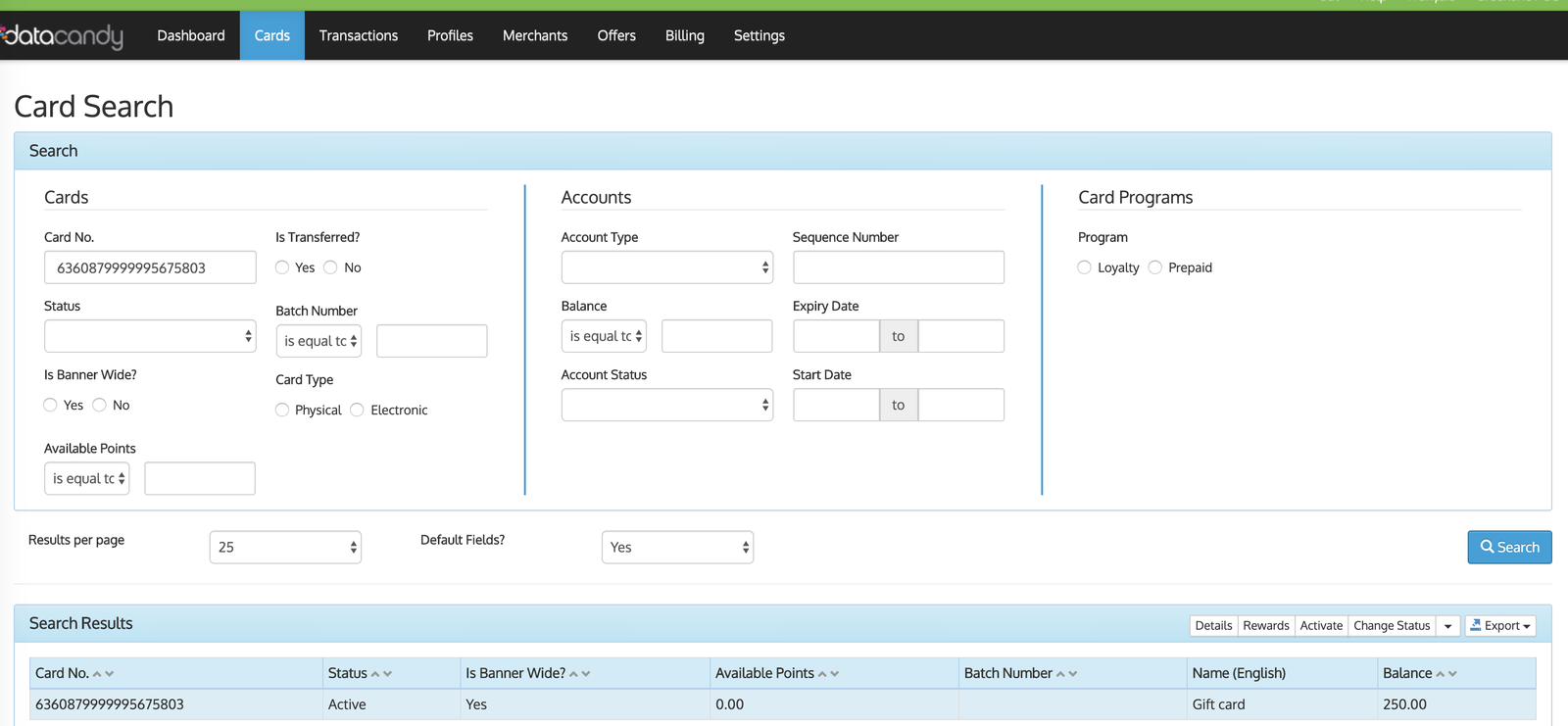 4. Go back to the Cards page, and search for the Merrco gift card number.