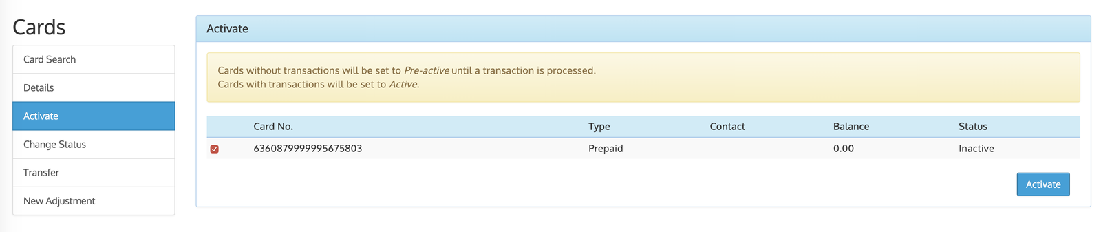 - Select Activate *This will subtract 1 inventory unit from your Merrco gift card product inventory to account for the physical card being sold to the customer.