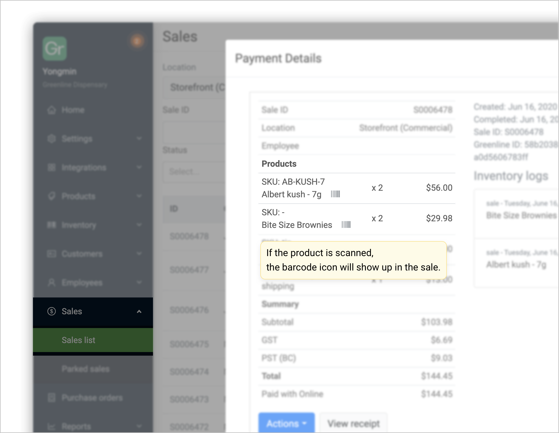 Inventory managers can see which products have been scanned and which haven't on the sales page after the order is paid. If a product was manually validated, the barcode icon will not show up in the sale.