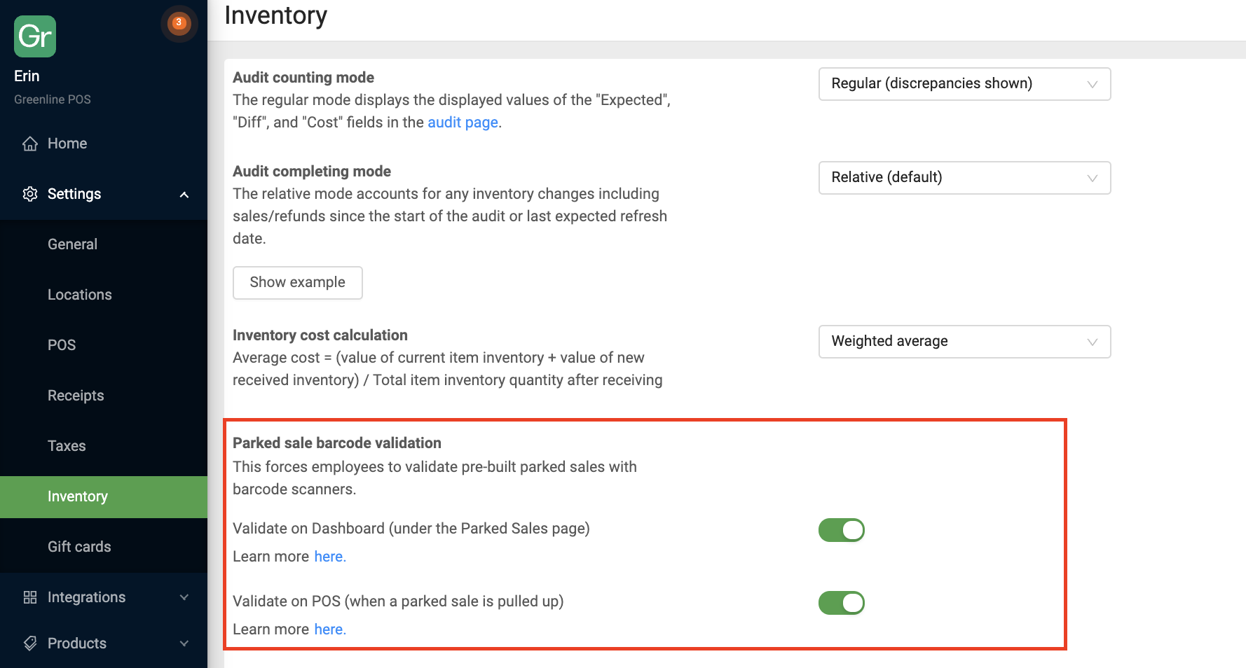 Enable the feature under Settings > Inventory > Parked sale barcode validation > Validate on Dashboard.