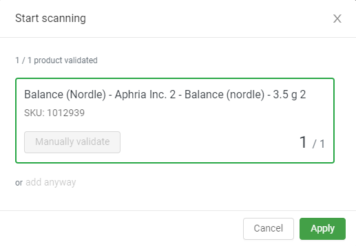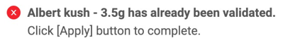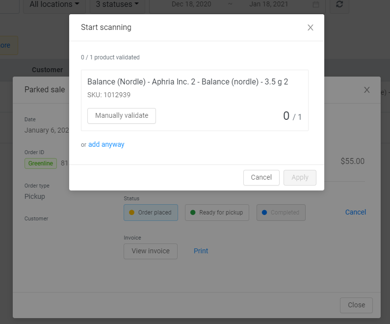 When the order detail pop-up screen is up to change the order status, the system will ask the budtender to scan or manually validate the product(s).