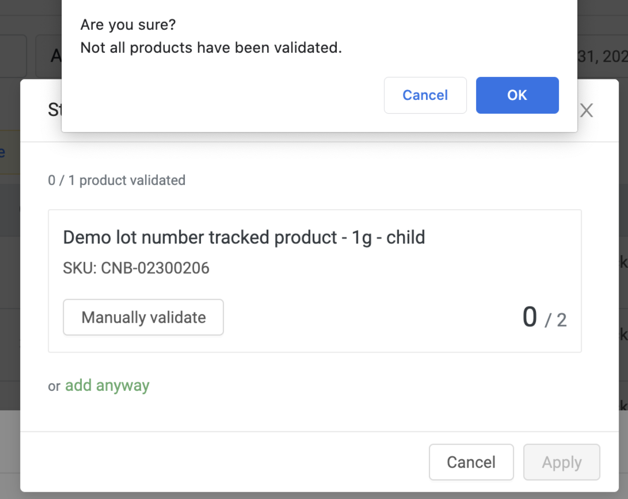 This will occur when you click on "add anyway" without scanning or manually validating the products. You can either complete the validation for those invalidated products or click “okay” to proceed. Only products that were included in the completed sales transaction and will impact inventory levels.