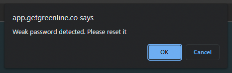A pop-up will appear, indicating that a weak password was detected. Click OK to be redirected to the password reset screen.