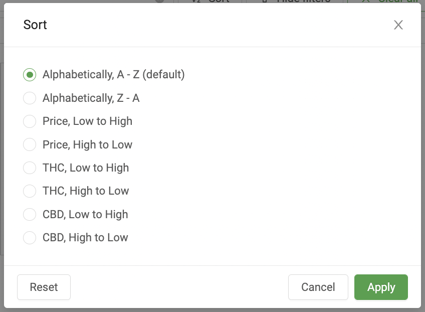 Note: when you sort THC / CBD in ranges, the max value will be used (ex: if the THC range is set to 15 - 20%, the feature will sort on the max value which in this case is 20%).