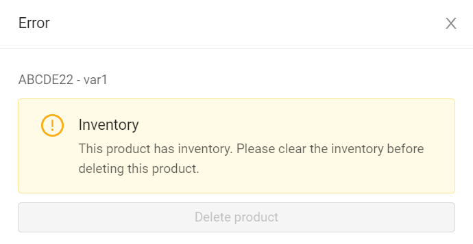 An error message will appear if you are attempting to delete a product that contains inventory, this includes parent products that contain variant products with inventory.
